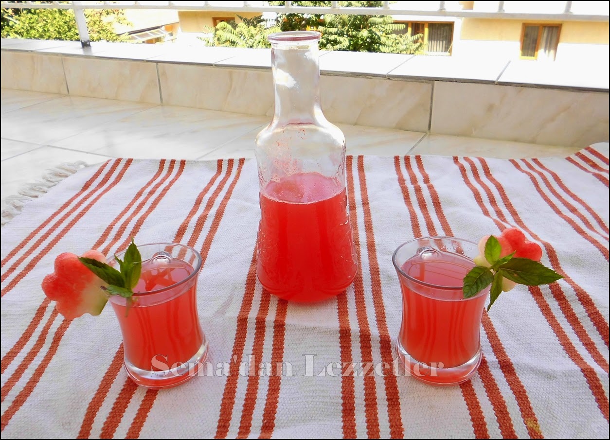 getirin. Limonlu karışıma ekleyip karıştırın.Üzerine suyu ekleyin tekrara karıştırın Benim karpuzum çok tatlıydı 3 su bardağı suyu kaldırdı Sizde şekerini ve suyunu kendi karpuzunuza göre ayarlayın Bir süzgeç yardımıyla posasını süzüp suyunu