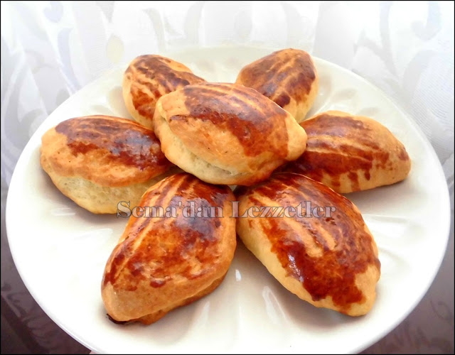 Tüm hamur malzemeleriyle yumuşak ama ele yapışmayan bir hamur yoğrulur.1 saat mayalandırılır.Mayalanan hamurdan iri ceviz büyüklüğünde parçalar koparılıp,avuç içinde açılır.İçine 1 tatlı kaşığı kadar iç malzemeden konur.kapatılır.Üzerlerine ayırdığımız yumurta sarısının içine 1 çay kaşığı silme pudra şekeri konulur çatalla karıştırılır ve sürülür.Isıtılmış 200 derece fırında pişirilir..